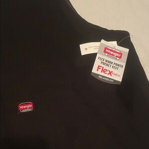 NWT Wrangler Zip Up Vest Workwear, Heavy Duty, Rain Resistant Flex Workwear Power Pocket Black with Red Wrangler Logo External & Internal Pockets Quilted Lining XXL 💥Make Me An Offer💥 All Offers Accepted or Countered! Bundle & Save! Classic black vest by Wrangler. Ideal for layering. Features a full zip front.