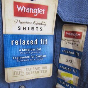 New with tags Wrangler relaxed fit blue long sleeve button-up canvas work shirt. Size 2XL. 28" armpit to armpit and 32" top of collar to bottom of hem. 4248
