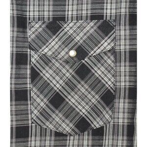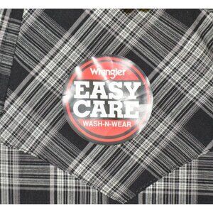 This NWOT Wrangler Western button-up shirt features a black plaid design, made with easy-care fabric for everyday wear. It includes pearl snap buttons and front pockets, perfect for outdoor or rodeo activities.