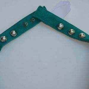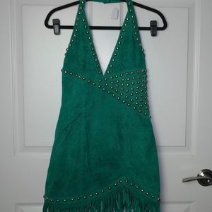 Description: new with tags X by NBD Nomi Halter Dress, fully lined green suede with open back and hidden zipper, halter style with 3 adjustable hook and eye closures on straps, round silver stud accents, fringe hem, size XS.
