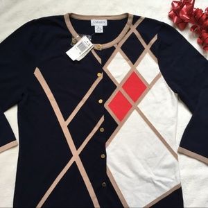 Super classy, warm button up sweater with argyle abstracted pattern. Gorgeous shiny buttons.