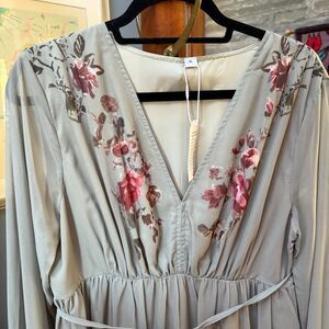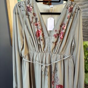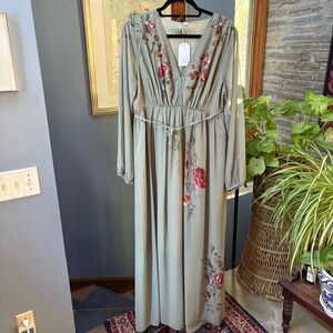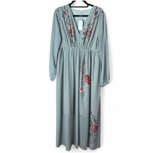 NWT XL Dusty Green Floral Maxi Dress ft. Billowy Sleeves, V-Neck, Sheer, Boho