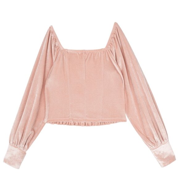 A big girl's corset effect top with balloon sleeves, banded cuffs and fully smocked back in an all over velvet.