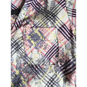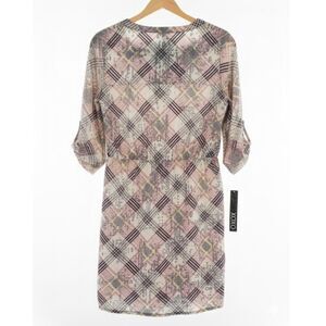 NWT XOXO Dress Sheer Ivory Navy Red Plaid Print V-Neck Tunic Tie Waist Boho M