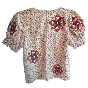 Madewell embroidered puff-sleeve quilt patchwork blouse in soft cream floral cotton. Features warm red and brown patchwork embroidery, V-neck, and button front. Short puff sleeves with 5" button cuffs. Lightweight and breathable — the perfect mix of romantic, vintage, and cottagecore charm.