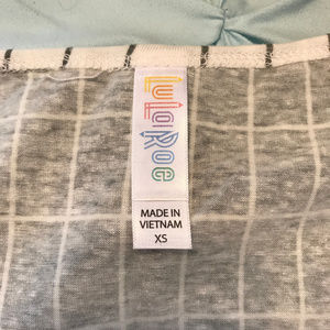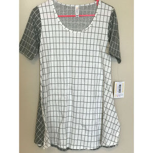 New with tags extra small LuLaRoe Perfect Tee. Grey and white geometric design; white background on the front, grey background on the back and sleeves. Can be worn with leggings, jeans, skirts.