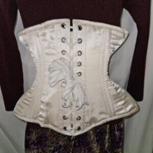 CORSET FEATURES: All around double German sprung steel boning for shaping, strength and cinching POWER. Outer shell 100% silk, 100% cotton lining, full HIPS and RIBS for a comfortable fit, a strong waist tape, adjustable back lacing with generous privacy panel and six garter tabs for detachable garters sold separately in my closet. Front length 12" Back Length 13" for excellent lumbar support. Cut straight across the top with plenty of tummy control, curved up over the thigh for easier sitting and down over the hips for a stunning HOURGLASS silhouette.