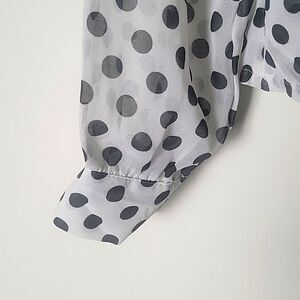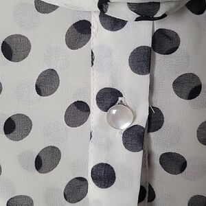 Polka Dot / High Ruffle Neck / Long Relaxed Flounce Sleeves / Semi Sheer / Bib Ruffle Front / Pearlescent Button Cuff Sleeves and Front