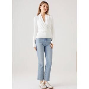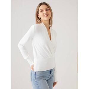 The surplice neckline adds a touch of elegance, while the tuckable design allows for a variety of styling options.