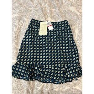 Band of the Free Womens Collette pull on skirt, teal and cream geometric pattern, ruffle hemline, smocked back waist, 100% Polyester, size XS NWT.
