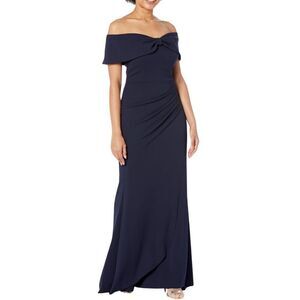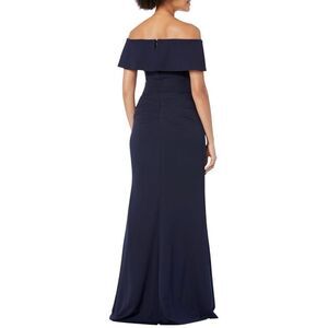 NWT XSCAPE Navy Scuba Ruched Off the Shoulder Evening Formal Gown