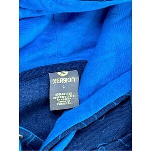 NWT Xersion Blue Geometric Graphic Hooded Sweatshirt Jacket sz LARGE. Nice and thick fabric with kangaroo pocket, ribbed knit cuffs and waistband also drawstring hoodie. 80% Cotton 20% Polyester. Machine washable. Item in excellent condition. No known rips, tears, holes, stains or defects. Retails $75