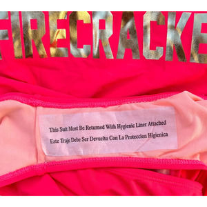Color Listed On Tag is Electric Red, But I would characterize it as Hot Pink/Coral As Referenced. The word FIRECRACKER is a bright, metallic gold. This is such a fun suit!