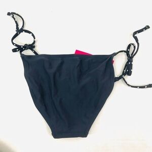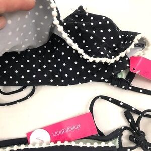 Adorable navy and white polka dot bikini. The top features a ruffle overlay and pom pom detail and ties in the back. It is lightly padded with removable pads. The bottoms are solid navy with pom pom detail at waist and the straps have white polka dots. The bottoms can be adjusted for comfort with the side ties. The perfect bikini for Summer!!