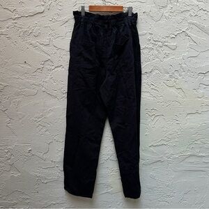 straight leg pant has an elastic paper bag waist with button fly, side seam pockets, and back left pocket
