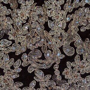 The NWT X by Xscape Women's Size 12 Black Gold Full Length Illusion Sleeveless Gown is a stunning formal dress perfect for weddings, parties, or cocktail events. Made from a polyester and spandex blend with a mesh fabric bodice, this gown features intricate acrylic rhinestone accents and a sheer back design. The dress has a round neckline, zip closure, and offers a stretchy skirt for a comfortable and flattering silhouette. With its elegant style and solid black color, this gown is a versatile and sophisticated choice for various occasions throughout the year.
