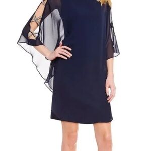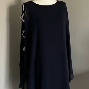 Never Worn New with Tags Navy Blue. Out of stock everywhere. Chiffon overlay that brings its femininity to the forefront, while rhinestone straps along the sleeves add plenty of glamour.Product Details: Size 6 Style 1677X, Pullover, Round neck, 3/4 cape sleeves, Lined, Imported. Product Specifications 36 in Length. Material & Care:Chiffon, jersey, Polyester, spandex.