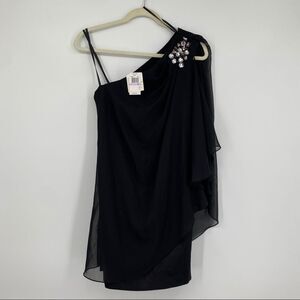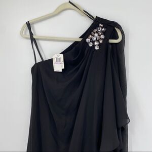 NWT Xscape Joanna Chen Rhinestone One Shoulder Flutter Hem Sheer Chiffon Dress