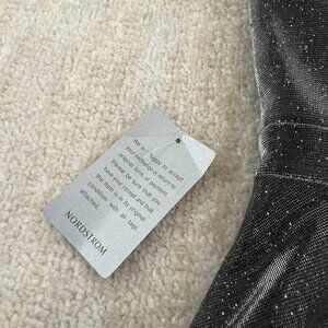 A black and silver off the shoulder mini dress. Dress is lined. Fabric has some stretch. Brand sold at Nordstrom.