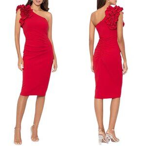 NWT Xscape Scuba Crepe One Shoulder Ruffle Detail Sleeveless Midi Dress in Red