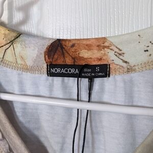 NWT, New, New With Tags, Women, Woman, Women's, Long Sleeve, Top, Shirt, Blouse, Printed, Y2K, 90s Style, Retro, 1990s, V-Neck, Comfy, Casual, All Over Print, Floral, Leaves, Fall Leaves, Fall, Neutral, Warm Tones, Blue, Orange, Tan, Cream, Yellow, Size Small, Size S, Noracora, Polyester, Cotton Blend, Watercolor, Wearable Art
