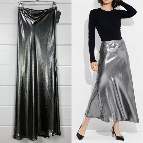 NWT Y2K Metallic Silver Maxi Skirt XXS Glam Trumpet ALine Futuristic NYE Holiday