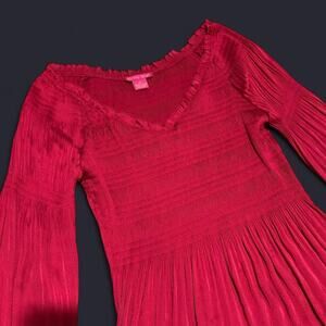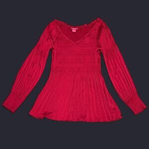 Y2K Sunny Leigh red long balloon sleeve pleated v neck romantic fairy tunic top - Size Medium, see measurements below!