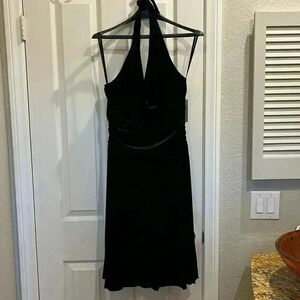 Description: Vintage Deadstock AB Studio Velour halter mini dress with bow tie at neck, rouching at waist, and fit and flare skirt. Hits about at knees. Material is soft and stretchy. Perfect for a formal event, holiday event, holiday party, NYE party, date night, special occasion.