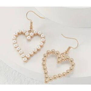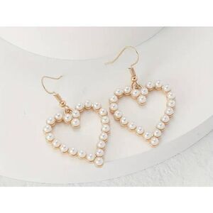 NWT NEW Y2K Bohemian Style Heart Shaped Faux Pearl With Gold Color Trim Dangle Hook Earrings.