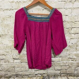 YA Los Angeles Womens Medium Fuschia Bell Sleeve Aztec Embroidered Top new with tags.