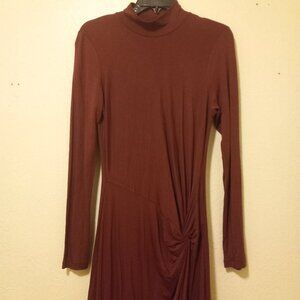 Stunning dress, in a super comfy jersey fabric. You'll be the comfiest belle at the ball. Mock neck, long sleeved, maxi dress. Jersey material drapes and has some stretch. Twist detail at side and slit. Elongating and slimming. A muted rust tinged burgundy/maroon/mauve. Tried on once. Soooo comfy. New with tag attached.