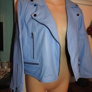 Brand new with tag from Saks Fifth avenue by Cut 25 YIGAL AZROUEL. Genuine leather in light blue. Cropped Motorcycle style. Black elastic panel in back. MEASUREMENT across the front of the waist unstretched but because of the elastic back panel it stretches several inches to about 18” across