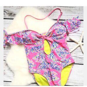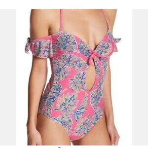 NWT YMI Swimwear Sz S Beautiful One Piece Swimsuit Pink w Palm Print Vacation!
