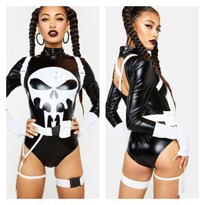 Da Punishing Costume Set cuz yer the one who brings the pain. Take no mercy on 'em in this sikk costume that includes a slick body-huggin' long sleeve bodysuit with an epic skeleton graphic, an adjustable utility belt 'N garter that wraps around yer leg with multiple compart