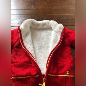 Details: A reversible sweater. One side is a red knit crewneck sweater with a high-pile white fuzzy marshmallow fleece inside. Reverse it for looks!!! Yellow zipper accent. Collared. Thick and warm sweater perfect for fall and winter weather!!
