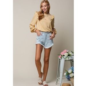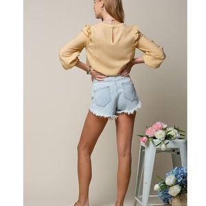 The Lila Ruffle Blouse in soft yellow features smoking sleeve bands and ruffle detailign on the shoulders.