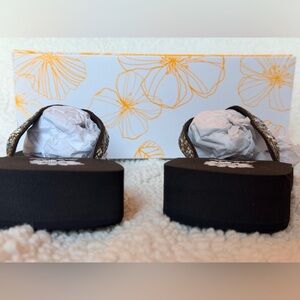 1.25 inch heel. Made from durable EVA material, they are lightweight and flexible, super comfy for all-day wear. I have several pairs of these and they are my go to for everything even over tennis shoes. Even at amusement parks etc! If you’ve never tried this brand, even if you don’t get these, I highly recommend yellowbox!