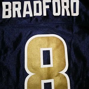 NWT Youth's NFL Sam Bradford #8 LA Rams jersey. Short sleeves, V-neck in signature team colors. All graphics are painted on, i.e. not a stitched jersey. Rams logo is in the middle of each sleeve, which has double gold stripes encircling the end of sleeves. Brand New. Sz XXL (18). From NFL Team Apparel.