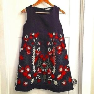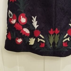 Sleeveless navy damask dress with front and back floral embroidery. A-line silhouette and midi length. Features a hidden back zipper and full lining. New with tags.