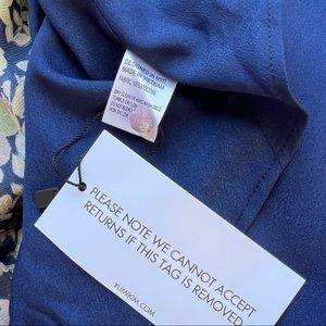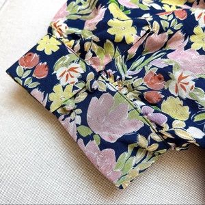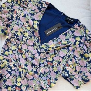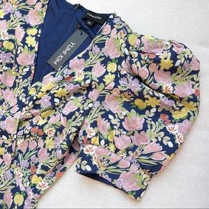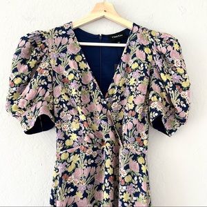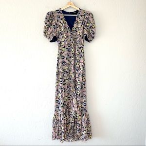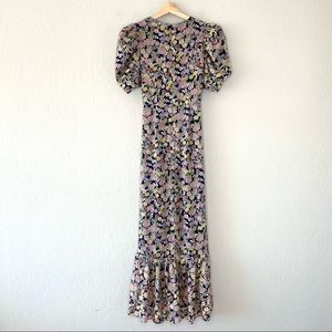 Gorgeous floral midi dress with short puff sleeves and a ruffle hem. Rounded hem with a front slit, fabric covered button on sleeve cuffs, faux wrap neckline, zipper closure, fully lined.