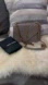 The actual color is pretty close to the picture with the model carrying it. Due to the lack of lighting. My picture make the bag look darker.