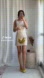 Short dress with straight neckline and straps with bow detail. Matching interior lining.