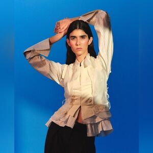 This is two pieces in one as it is a multi-layered shirt. The bottom layer is a romantic piece, while the top layer of the vest is a washed silk organza that has been entirely embroidered. Both pieces can be used independently.