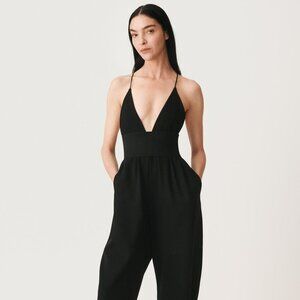 V-neck jumpsuit with thin straps that cross at the back. Side in-seam pockets. Wide elastic belt with adjustable metal hooks. Pleats at the waist and an invisible back zip fastening. SIZE XS GORGEOUS AND RARE FIND!
