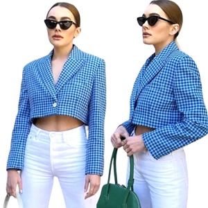NWT ZARA Blue Black Checked Cropped Blazer Jacket Size: XS