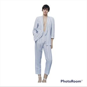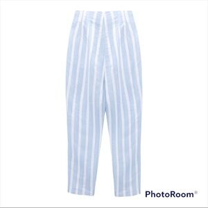 NEW with tags ZARA Blue White Stripe Linen Blend High Rise Straight Leg Trouser Pants