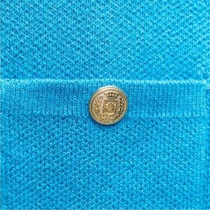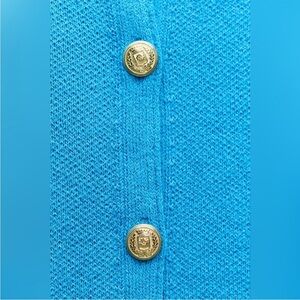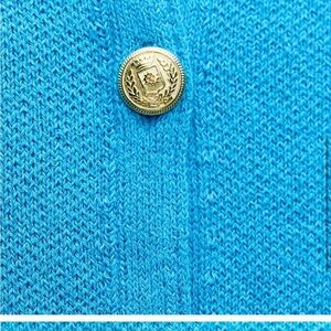 Elegant blue cardigan with gold buttons. Features two front pockets. Perfect for a chic look. OUTER SHELL