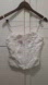 Corset top made of satin effect fabric. Straight neckline and adjustable spaghetti straps. Ruched fabric and raised floral details. Front metal hook closure. oyster white color