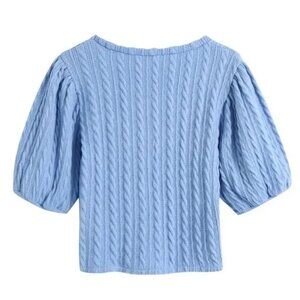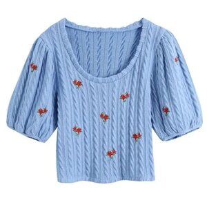 NWT ZARA Embroidered Cable Knit Short Sleeve Cropped Sweater Women’s Large Blue