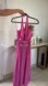 Halter dress with V-neckline and open back. Multi-positional self-belt with tonal matching flower. Side hidden in-seam zip closure.